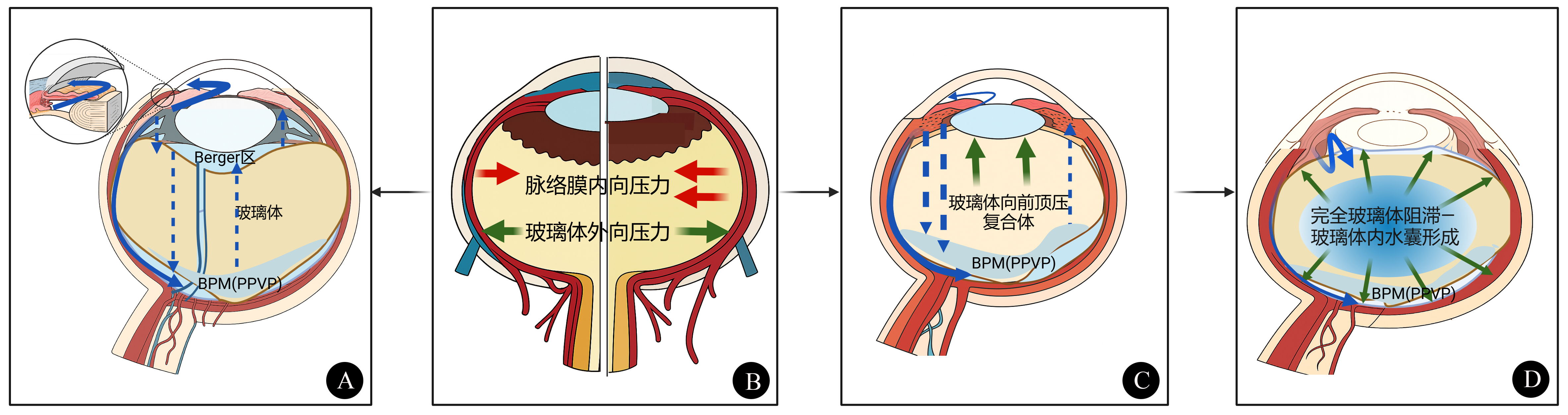 原发性闭角型青光眼(primary angle-closure glaucoma,PACG)是一类严重威胁视功能的致盲性眼病,其发病机制长期存在争议。传统观点将虹膜膨隆、晶状体前移及睫状体前旋等解剖学因素视为主要病因,但基于这些结构异常的治疗效果不一,提示这些更可能是疾病进展过程中的伴随结果,而非真正病因。基于此认识,本文聚焦于眼内液体循环异常所致腔室压力失衡对眼内各结构和功能的影响,以阐明PACG发生发展中的病理生理进程,主要包括脉络膜病理性膨胀或脉络膜上腔液体转运异常导致脉络膜-玻璃体压力改变,睫状体-悬韧带-晶状体-玻璃体前界膜-前部玻璃体复合体(ciliary body- zonules-crystalline lens-hyaloid-anterior vitreous complex, CZLHV)异常引起玻璃体腔-后房压力改变,CZLHV复合体再向前推挤虹膜导致后房-前房压力改变,最终虹膜根部关闭房角使得房水从小梁网引流受阻。通过系统总结脉络膜膨胀、玻璃体缓冲体系以及CZLHV复合体在PACG发生发展中的作用机制,以期为PACG的精准诊疗与发病机制研究提供新思路。