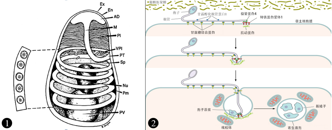 图1 微孢子虫结构示意图;图2 微孢子虫感染宿主细胞过程示意图