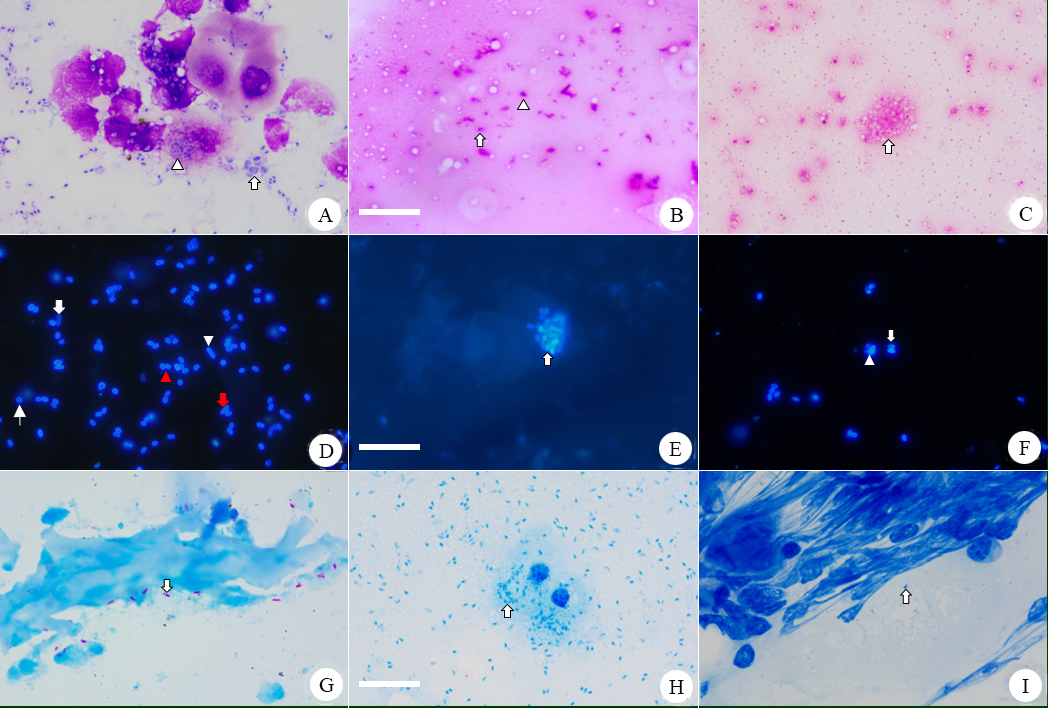 采用四种染色法(吉姆萨染色,真菌荧光染色,革兰染色,抗酸染色)行角膜刮片细胞学检查,结合宏基因组二代测序(metagenomic next-generation sequencing,mNGS),分析不同方法检出率及mNGS病原谱。